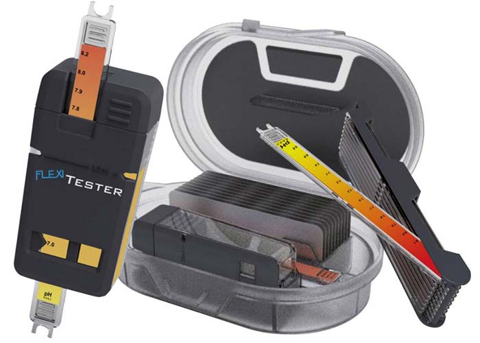 FlexiTester® sind zwar – wie Pooltester – visuelle Messgeräte, aber die Zuordnung der gemessenen Farbe zur Skala und die Ermittlung des Messwertes ist bei FlexiTester®n wesentlich präziser, weil die Messung mit einer laufenden Farbskala auf einem Parameter-Stick verglichen wird. Es gibt keine Messergebnisse „zwischen“ einzelnen Farbskalen.